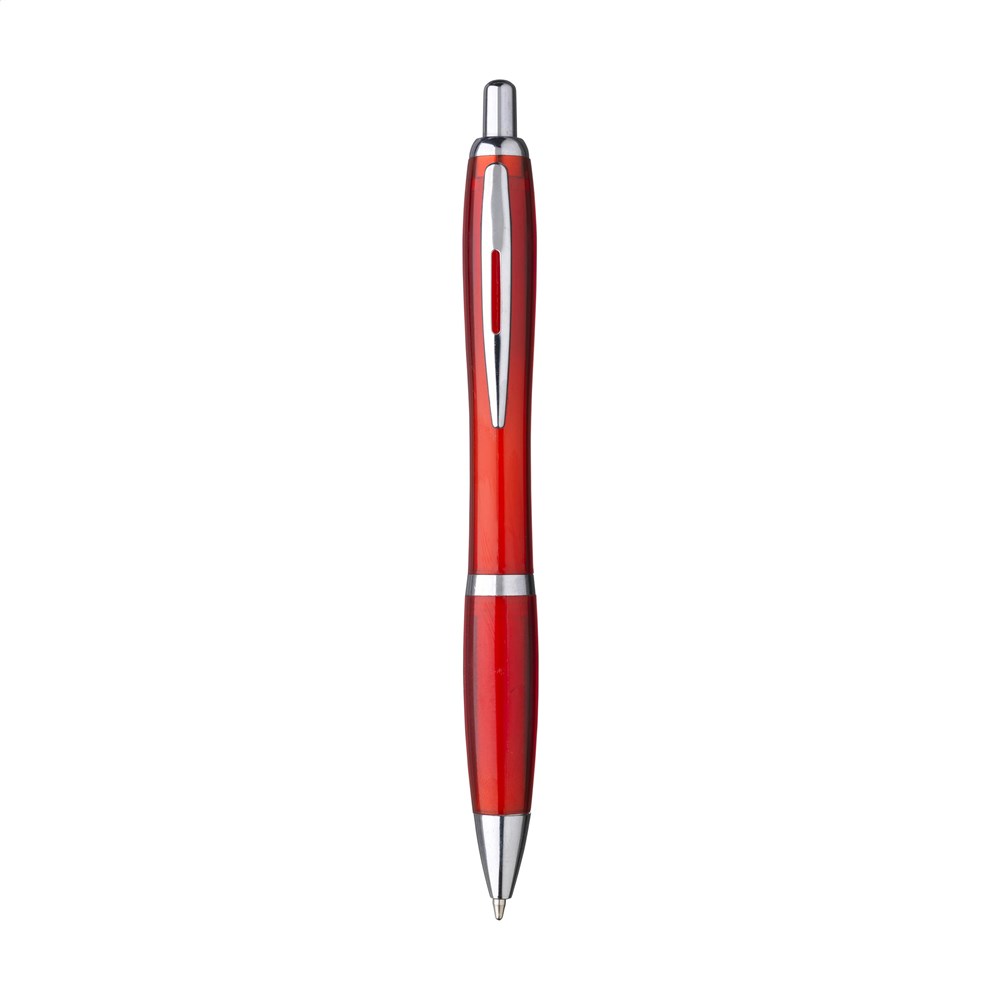 Blauwschrijvende balpen met transparant gekleurde houder van 100% gerecyled PET, hoogglans accenten en metalen clip.