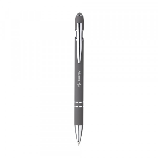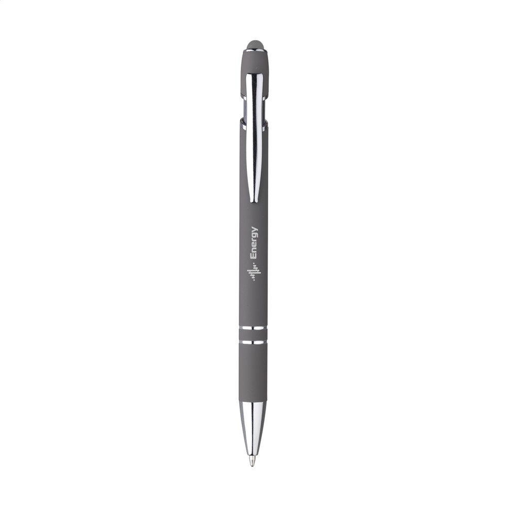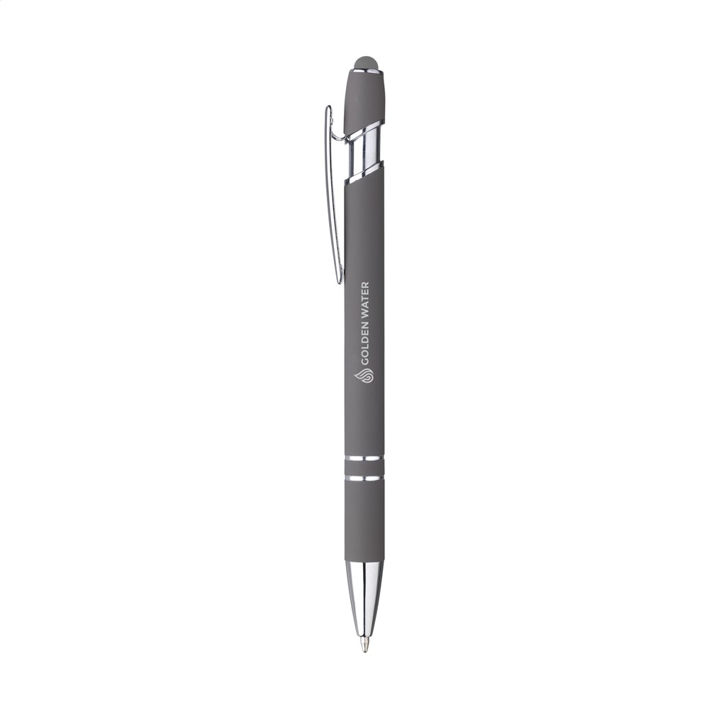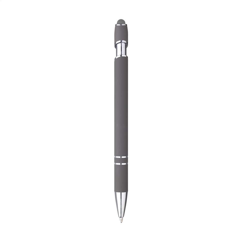 Slanke, blauwschrijvende balpen met aluminium houder. Voorzien van een rubberised soft touch finish en een rubberen top/pointer. Stevige metalen clip en kunststof puntstuk. NOTE: Digitaaldruk op de witte balpen is niet mogelijk.