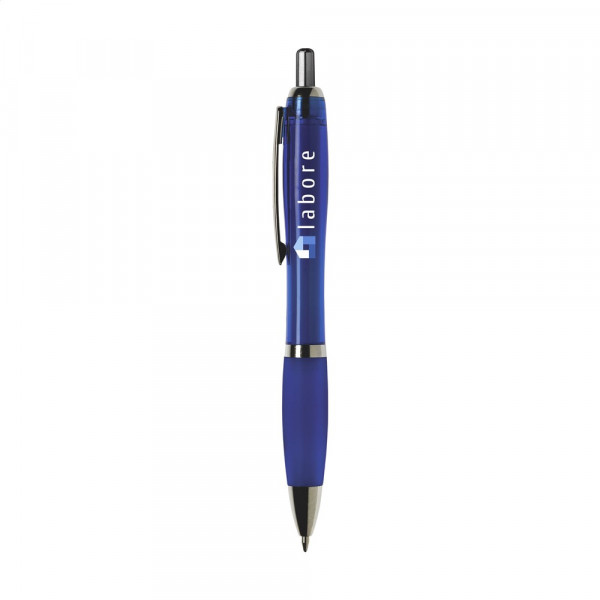 Blauwschrijvende óf zwartschrijvende balpen met transparantgekleurde houder, gripvast voorstuk en metalen clip.