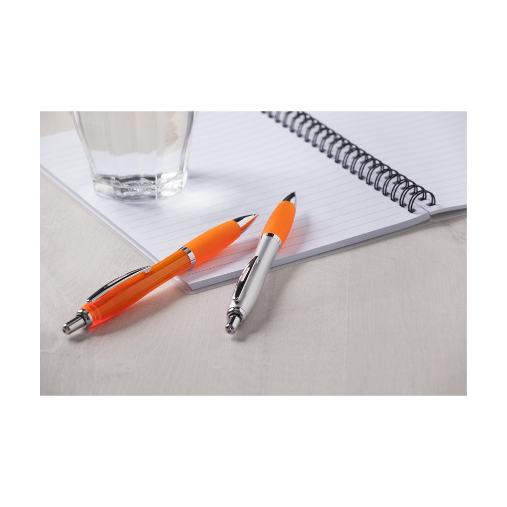 Blauwschrijvende óf zwartschrijvende balpen met transparantgekleurde houder, gripvast voorstuk en metalen clip.