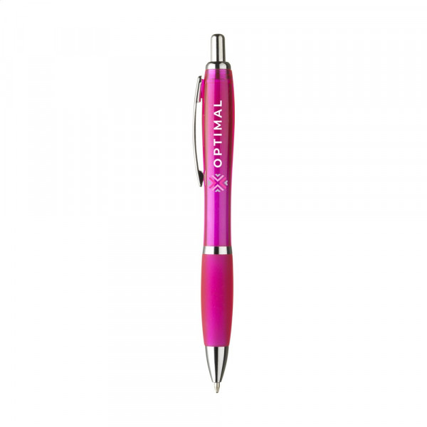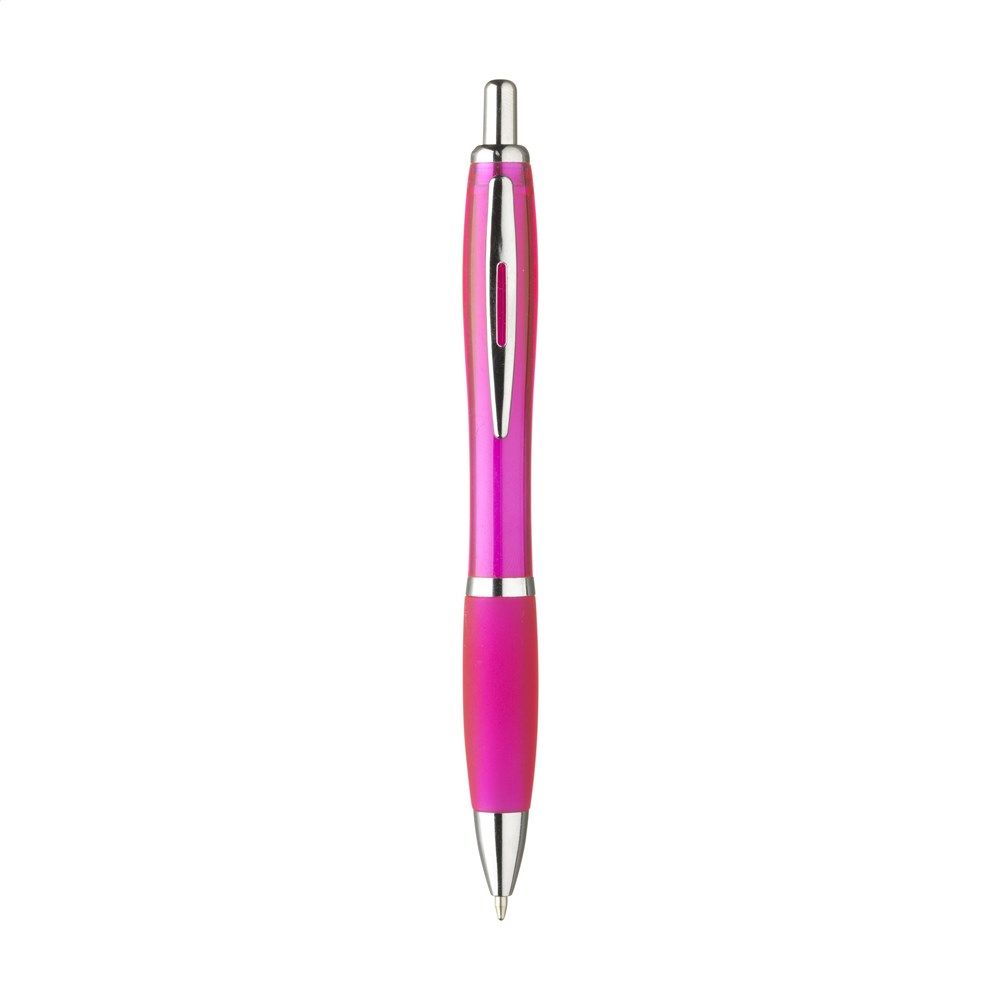 Blauwschrijvende óf zwartschrijvende balpen met transparantgekleurde houder, gripvast voorstuk en metalen clip.