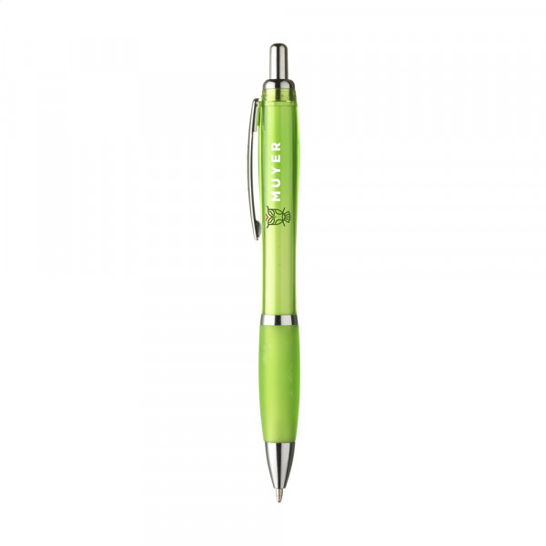 Blauwschrijvende óf zwartschrijvende balpen met transparantgekleurde houder, gripvast voorstuk en metalen clip.