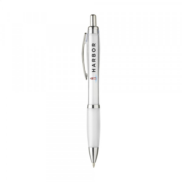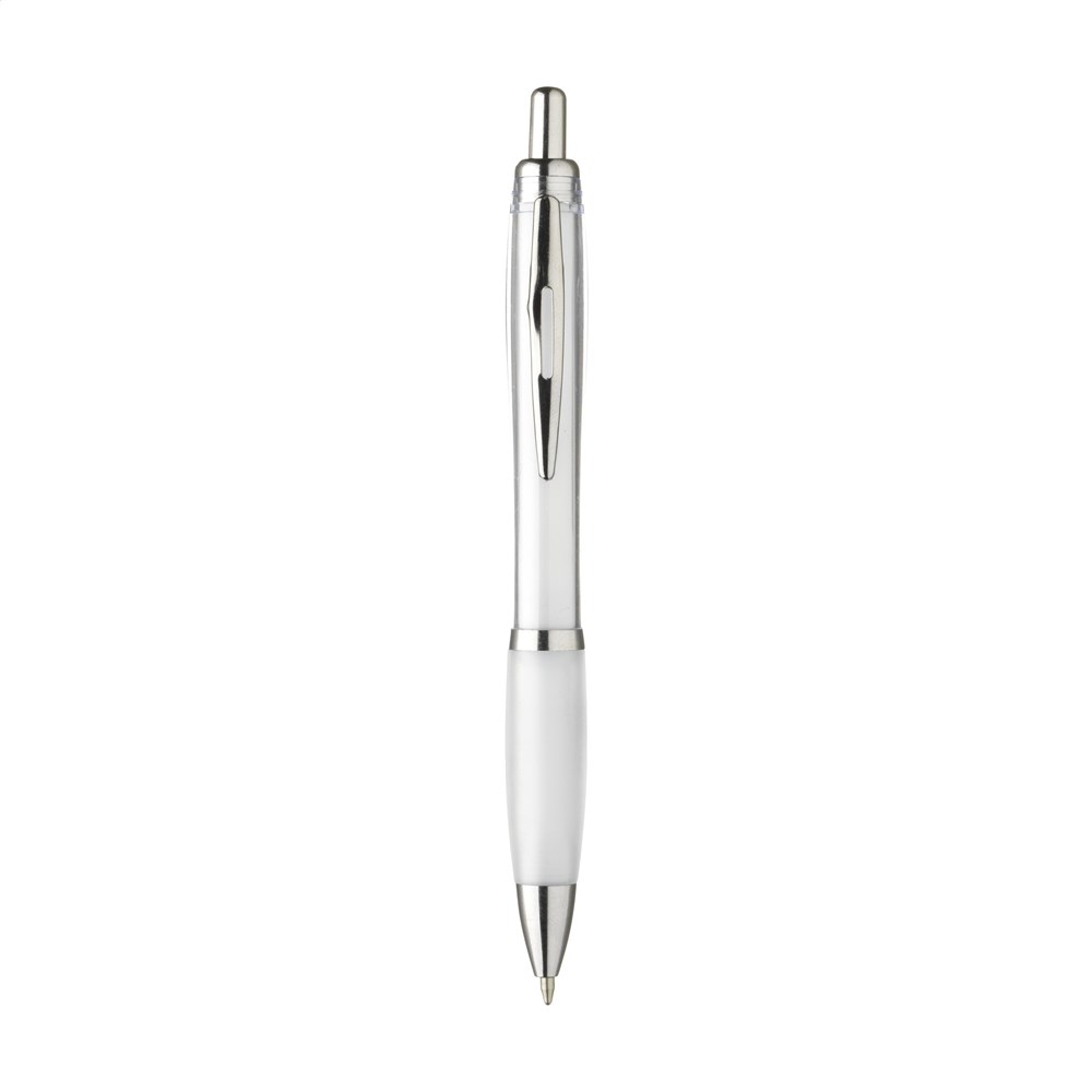 Blauwschrijvende óf zwartschrijvende balpen met transparantgekleurde houder, gripvast voorstuk en metalen clip.