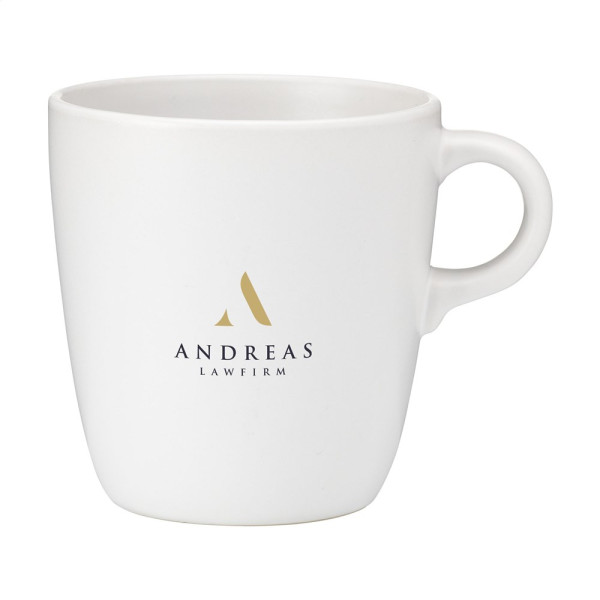 Mok in een eenvoudig, trendy design. Van hoogwaardig keramiek en voorzien van een matte toplaag aan de buiten- en binnenzijde. Inhoud 375 ml. OPMERKING: De witte mok kan niet worden voorzien van een lasergravure omdat deze onvoldoende zichtbaar is.