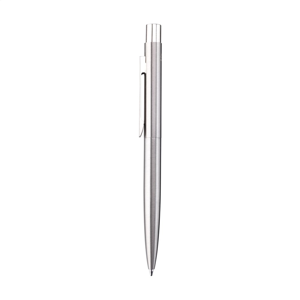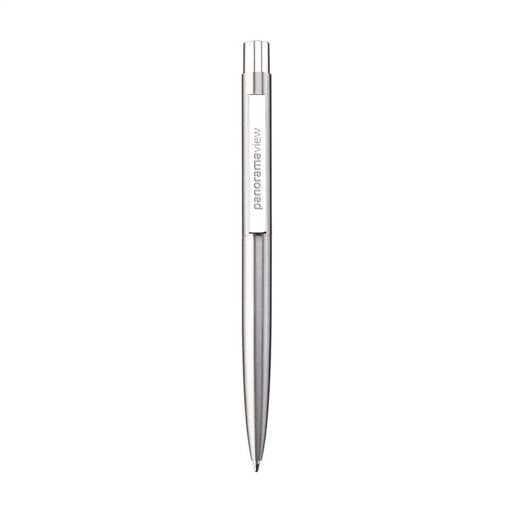 Deze blauwschrijvende pen heeft een mooie gepolijste houder gemaakt van gerecycled RVS. Met verchroomde accenten en verchroomde metalen clip. Een slank model met een chique uitstraling. Per stuk in een giftbox van zwart kraft karton. RVS kan vele malen gerecycled worden terwijl de kwaliteit van het materiaal grotendeels behouden blijft. Door het gebruik van gerecycled RVS worden minder nieuwe grondstoffen gebruikt. Dit betekent minder energieverbruik en minder gebruik van water.