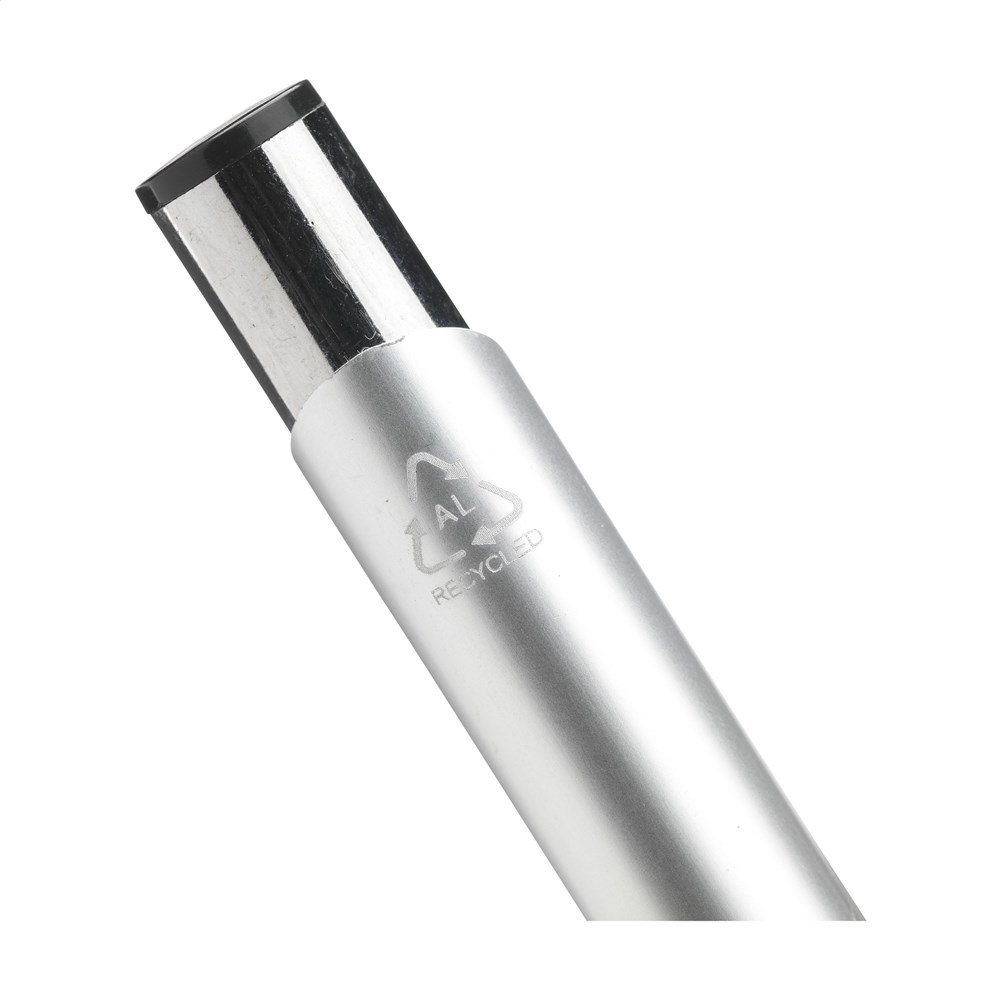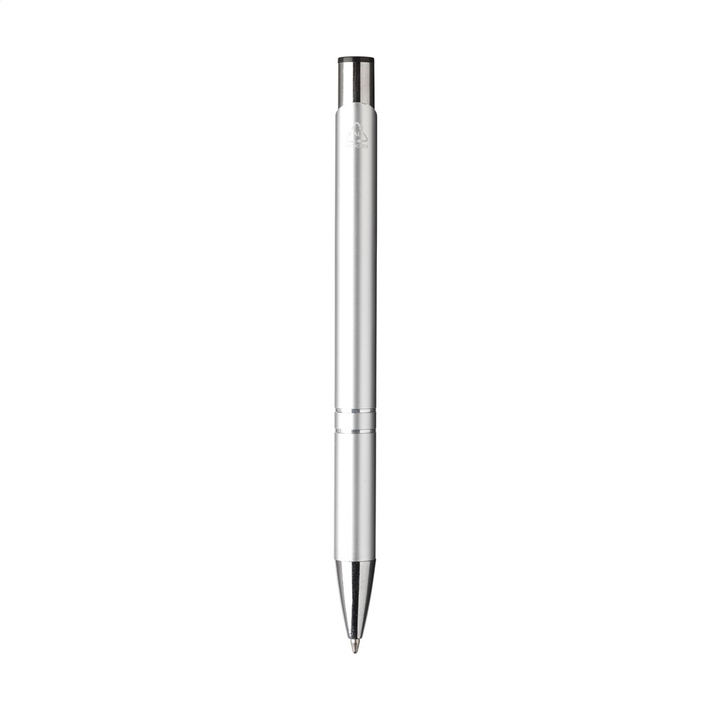 Blauwschrijvende balpen gemaakt van gerecycled aluminium. De houder is afgewerkt met een mooie glanzende, metallic look finish. Met metalen clip. Door het gebruik van gerecycled aluminium worden er minder nieuwe grondstoffen gebruikt tijdens de productie van dit product. Dit betekent minder energieverbruik en minder gebruik van water.