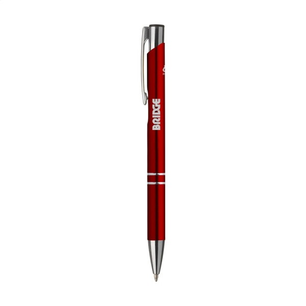 Blauwschrijvende balpen gemaakt van gerecycled aluminium. De houder is afgewerkt met een mooie glanzende, metallic look finish. Met metalen clip. Door het gebruik van gerecycled aluminium worden er minder nieuwe grondstoffen gebruikt tijdens de productie van dit product. Dit betekent minder energieverbruik en minder gebruik van water.