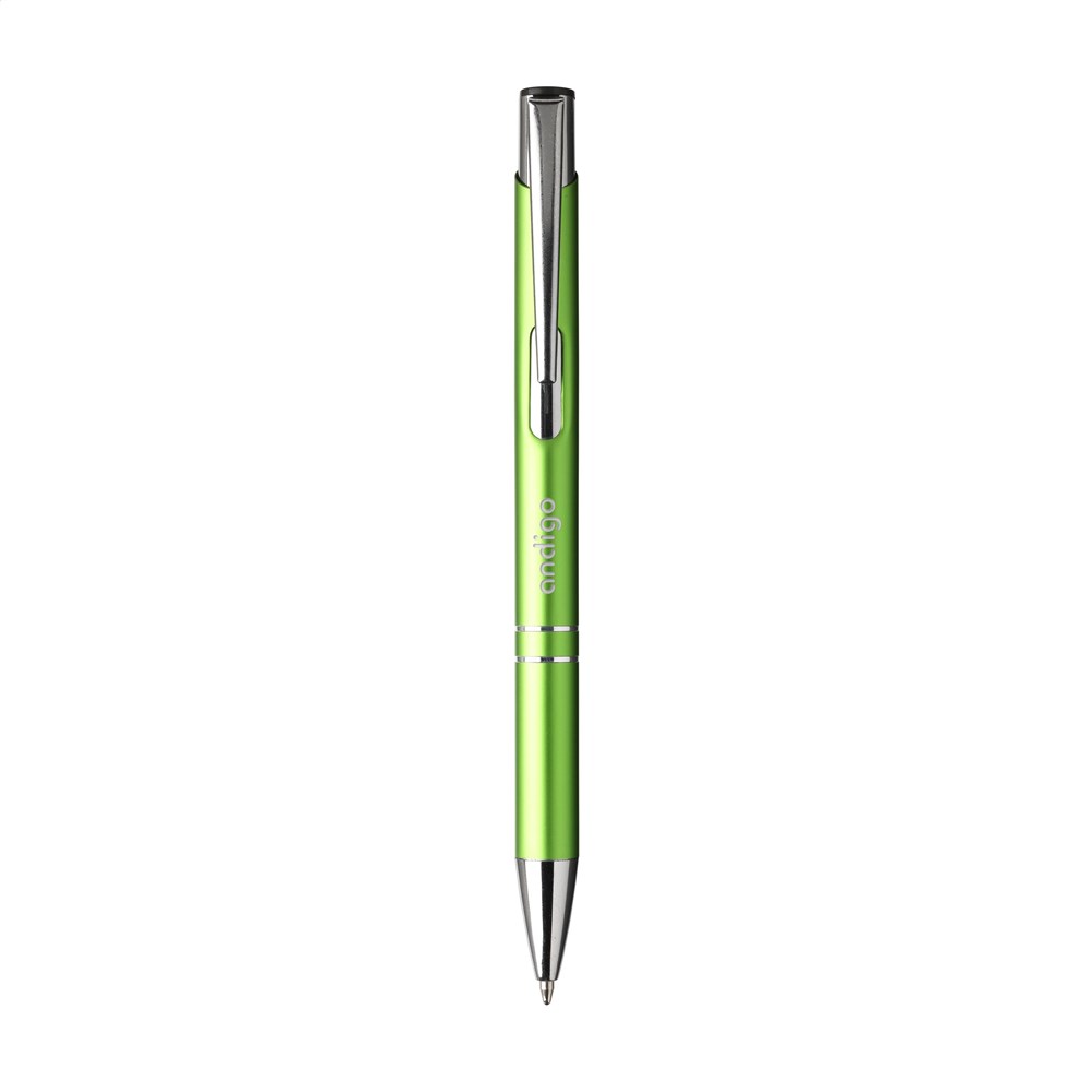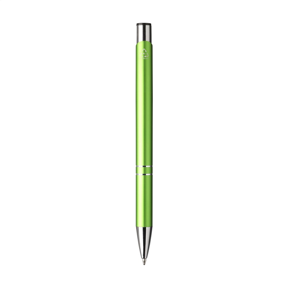 Blauwschrijvende balpen gemaakt van gerecycled aluminium. De houder is afgewerkt met een mooie glanzende, metallic look finish. Met metalen clip. Door het gebruik van gerecycled aluminium worden er minder nieuwe grondstoffen gebruikt tijdens de productie van dit product. Dit betekent minder energieverbruik en minder gebruik van water.