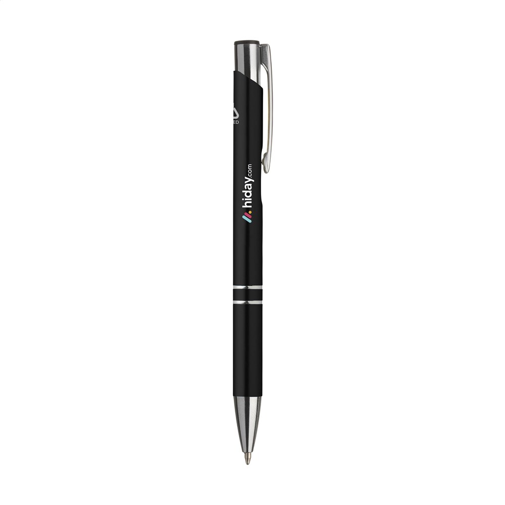 Blauwschrijvende balpen gemaakt van gerecycled aluminium. De houder is afgewerkt met een mooie glanzende, metallic look finish. Met metalen clip. Door het gebruik van gerecycled aluminium worden er minder nieuwe grondstoffen gebruikt tijdens de productie van dit product. Dit betekent minder energieverbruik en minder gebruik van water.