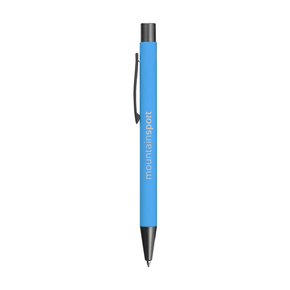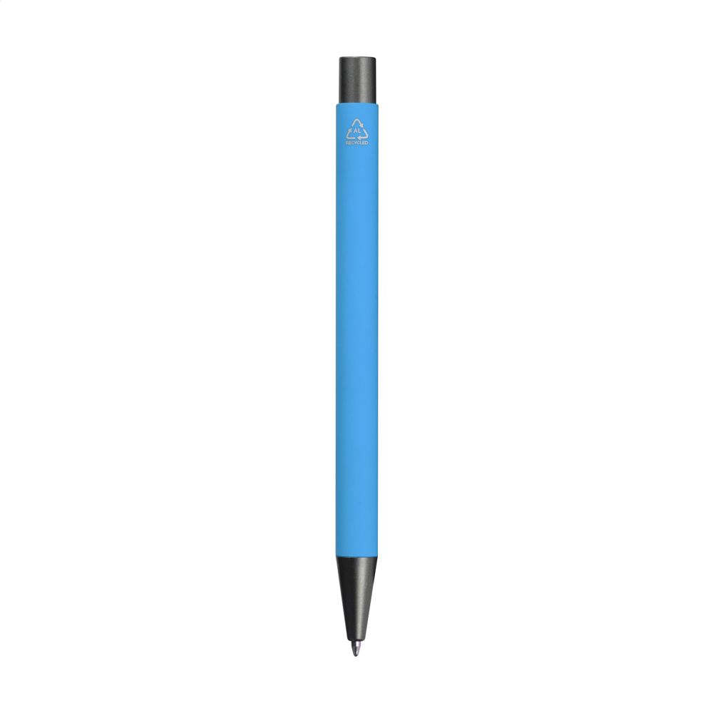 Blauwschrijvende balpen gemaakt van gerecycled aluminium. De houder is afgewerkt met een mooie rubberised finish. Met stevige metalen clip en kunststof puntstuk en drukknop. Door het gebruik van gerecycled aluminium worden er minder nieuwe grondstoffen gebruikt tijdens de productie van dit product. Dit betekent minder energieverbruik en minder gebruik van water.