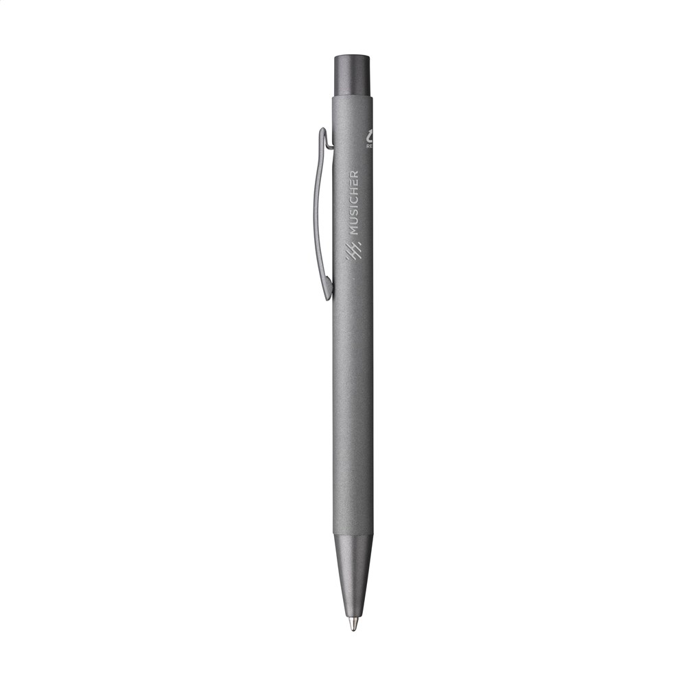 Blauwschrijvende balpen gemaakt van gerecycled aluminium. De houder is afgewerkt met een mooie rubberised finish. Met stevige metalen clip en kunststof puntstuk en drukknop. Door het gebruik van gerecycled aluminium worden er minder nieuwe grondstoffen gebruikt tijdens de productie van dit product. Dit betekent minder energieverbruik en minder gebruik van water.
