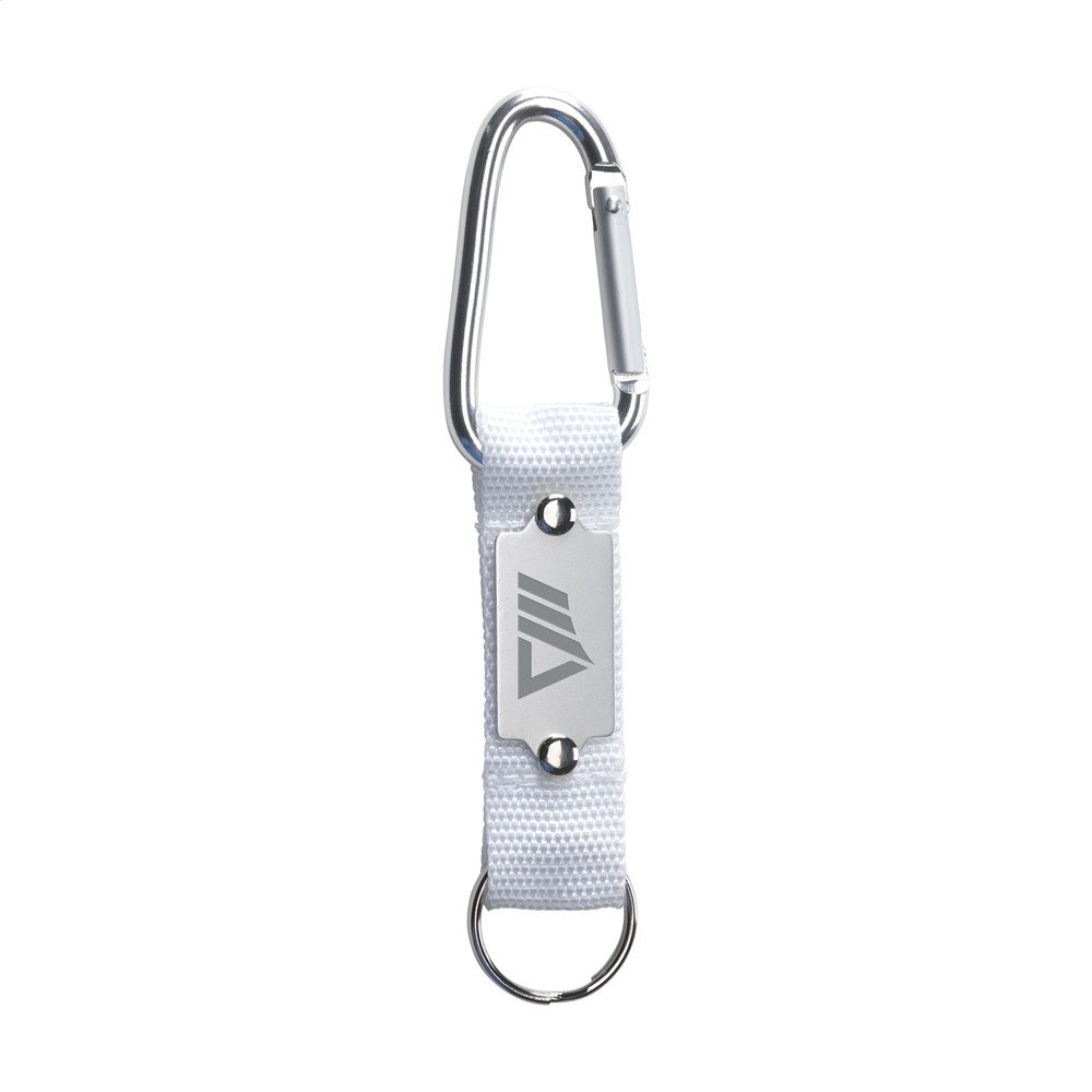 Karabijnhaak gecombineerd met sterk geweven nylon aan stevige sleutelring.