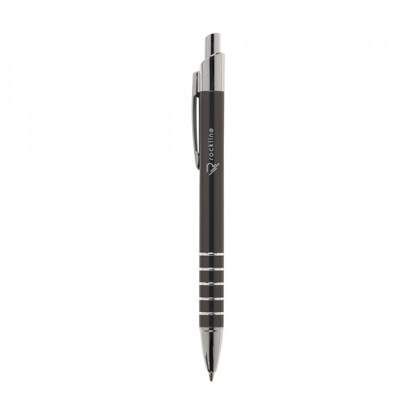 Blauwschrijvende, aluminium balpen in metallic look, met metalen clip en tussenringen.