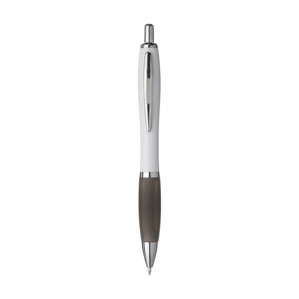 Zwartschrijvende balpen met wiitte houder met gekleurd, gripvast voorstuk en metalen clip.meer
