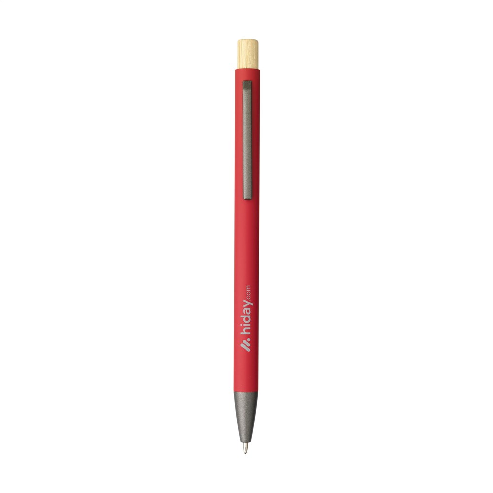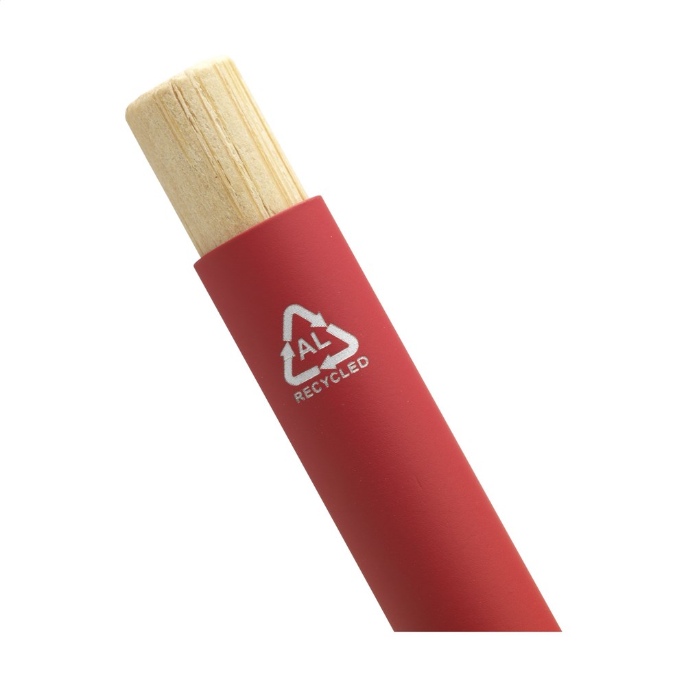 Blauwschrijvende, slanke balpen met houder van 100% gerecycled aluminium met een rubberised finish. Metalen clip. Strak vormgegeven. De bamboe drukknop geeft de pen een natuurlijk tintje. GRS-gecertificeerd. Door het gebruik van gerecycled aluminium worden minder nieuwe grondstoffen gebruikt. Dit betekent minder energieverbruik en minder waterverbruik.