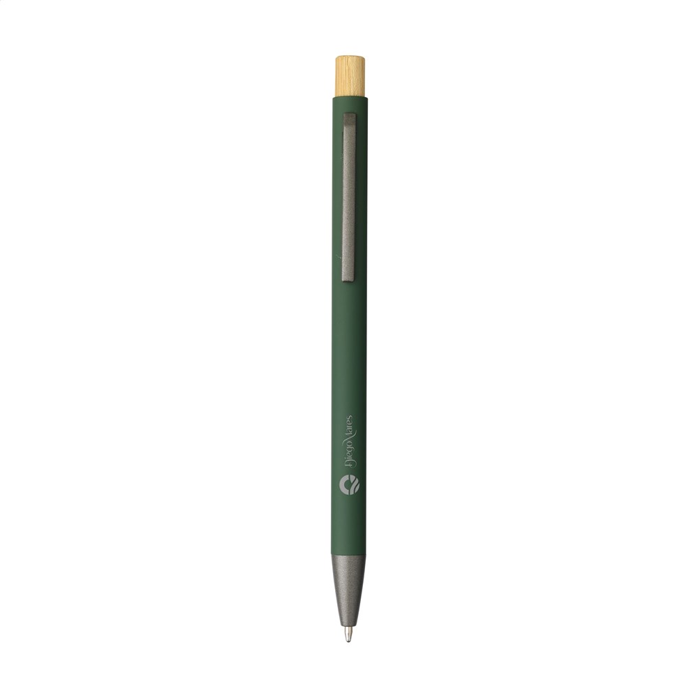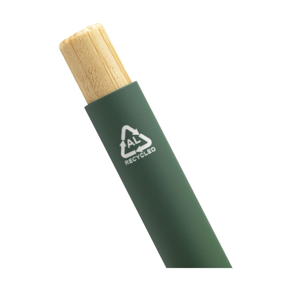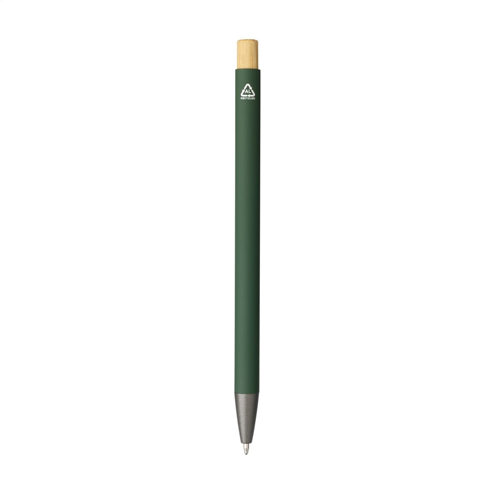 Blauwschrijvende, slanke balpen met houder van 100% gerecycled aluminium met een rubberised finish. Metalen clip. Strak vormgegeven. De bamboe drukknop geeft de pen een natuurlijk tintje. GRS-gecertificeerd. Door het gebruik van gerecycled aluminium worden minder nieuwe grondstoffen gebruikt. Dit betekent minder energieverbruik en minder waterverbruik.