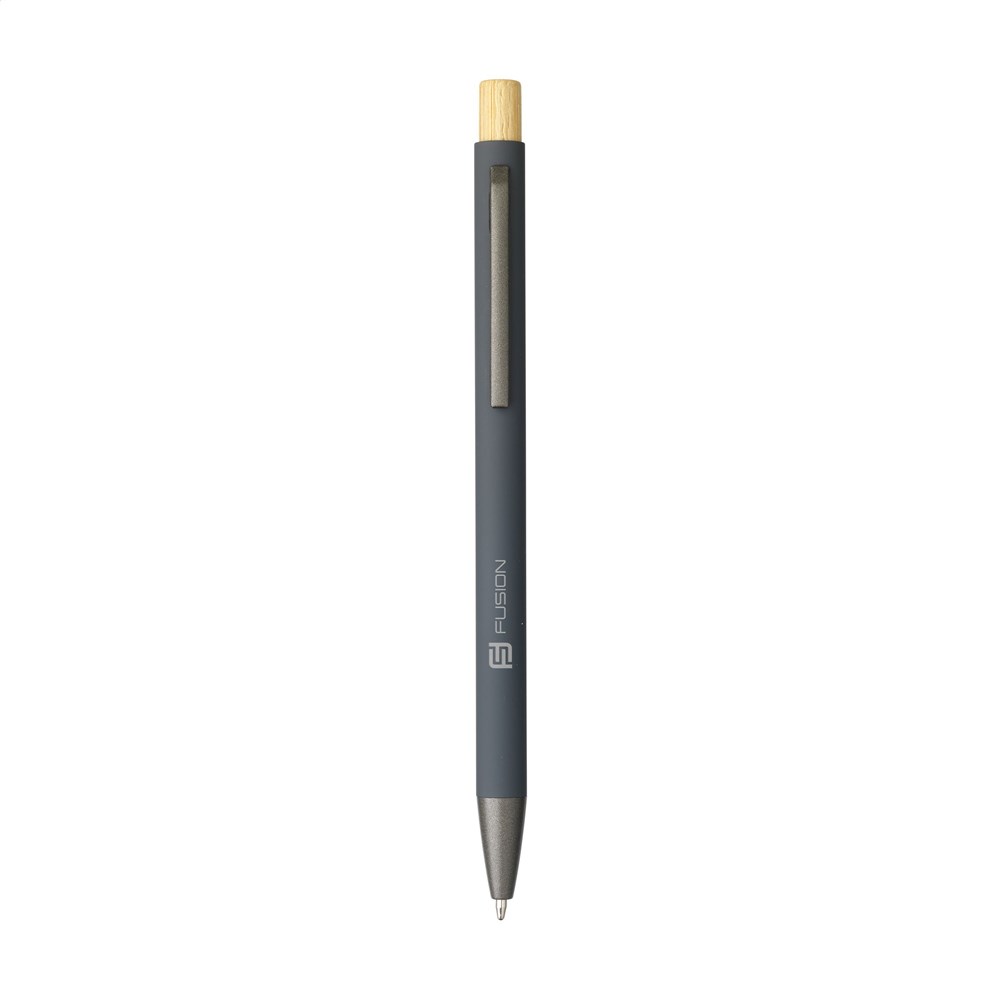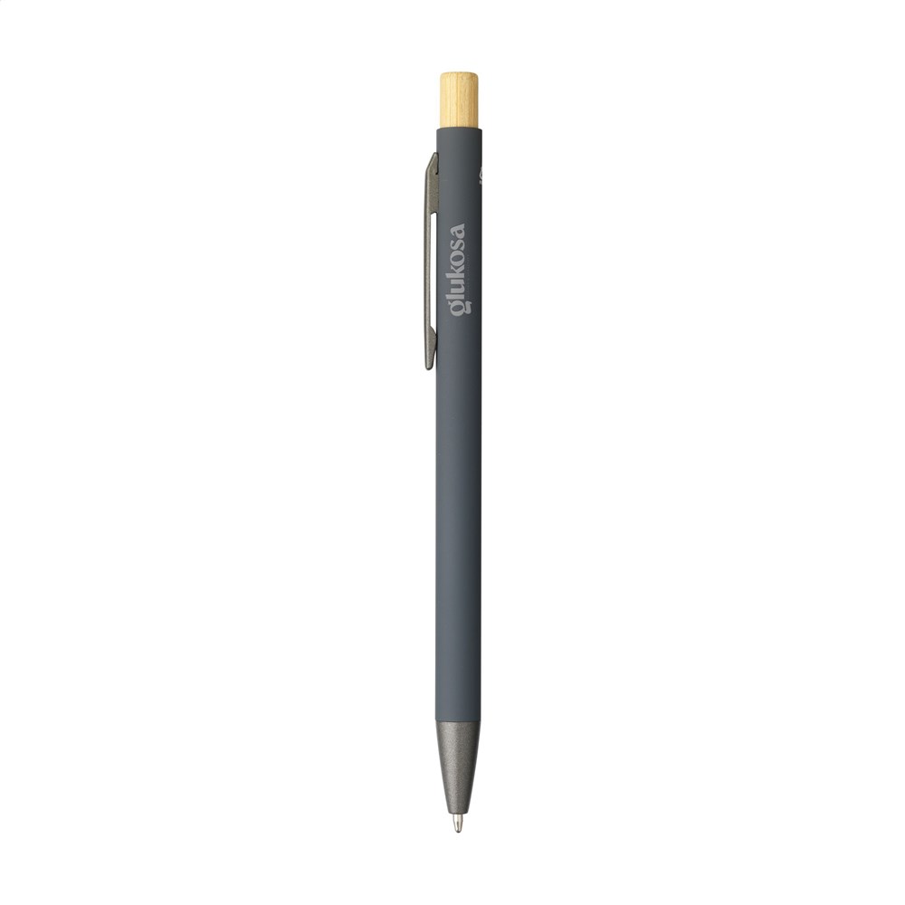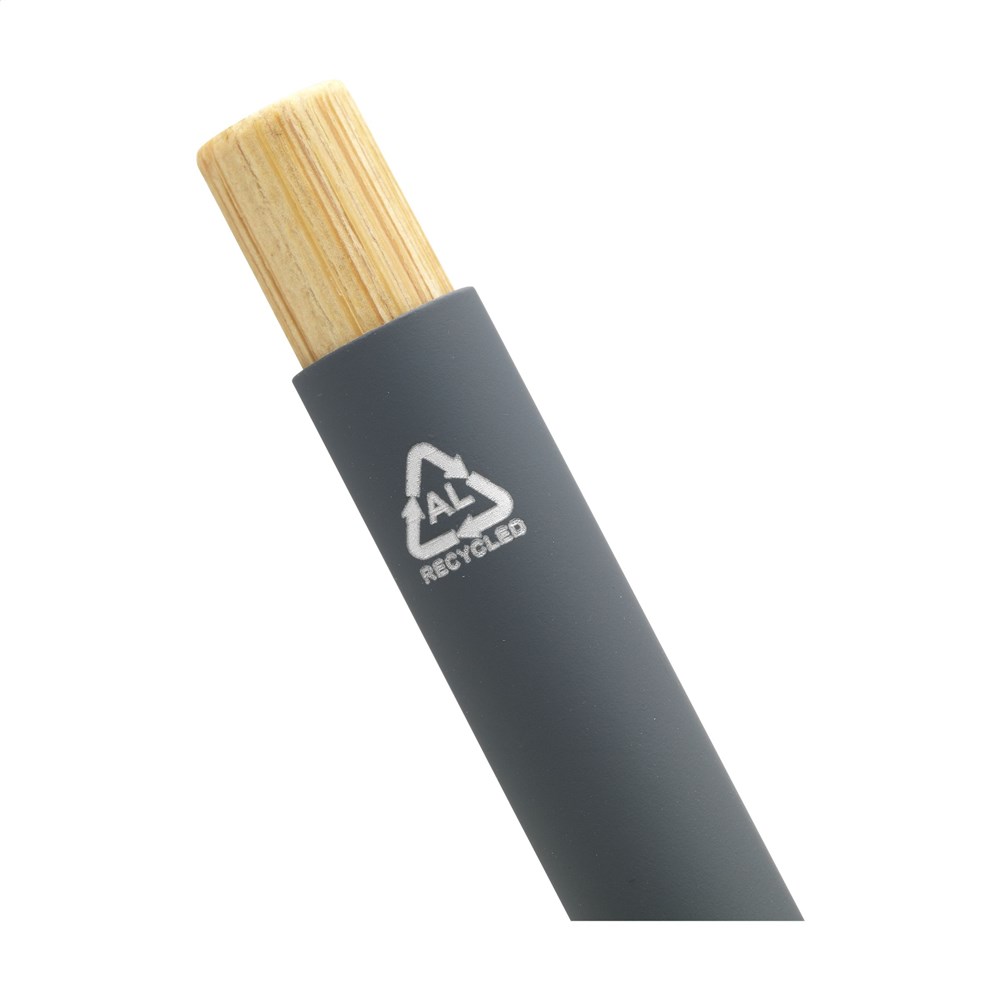 Blauwschrijvende, slanke balpen met houder van 100% gerecycled aluminium met een rubberised finish. Metalen clip. Strak vormgegeven. De bamboe drukknop geeft de pen een natuurlijk tintje. GRS-gecertificeerd. Door het gebruik van gerecycled aluminium worden minder nieuwe grondstoffen gebruikt. Dit betekent minder energieverbruik en minder waterverbruik.
