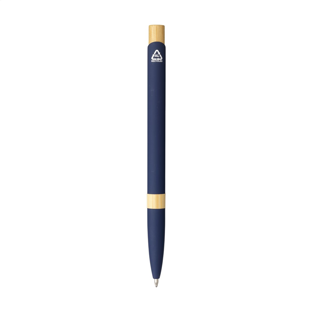 Blauwschrijvende, slanke balpen met houder van 100% gerecycled aluminium met een rubberised finish en stevige, metalen clip. De bamboe accenten geven de pen een natuurlijk karakter. GRS-gecertificeerd. Door het gebruik van gerecycled aluminium worden minder nieuwe grondstoffen gebruikt. Dit betekent minder energieverbruik en minder waterverbruik.