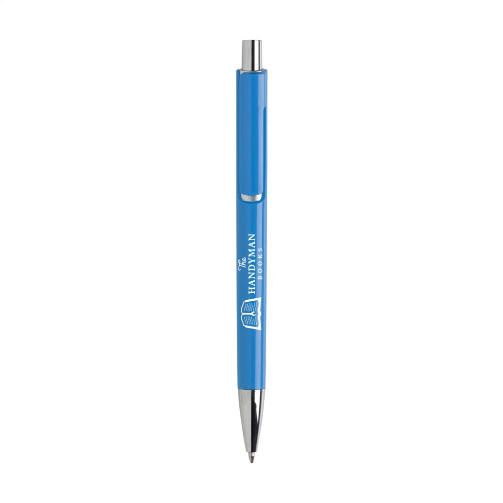 Blauwschrijvende balpen met uniek design: de body en clip van deze balpen zijn uit één geheel vormgegeven en dat maakt deze pen tot een bijzondere eyecatcher. Met opvallend zilverkleurig accent onder de optisch 'zwevende' clip.