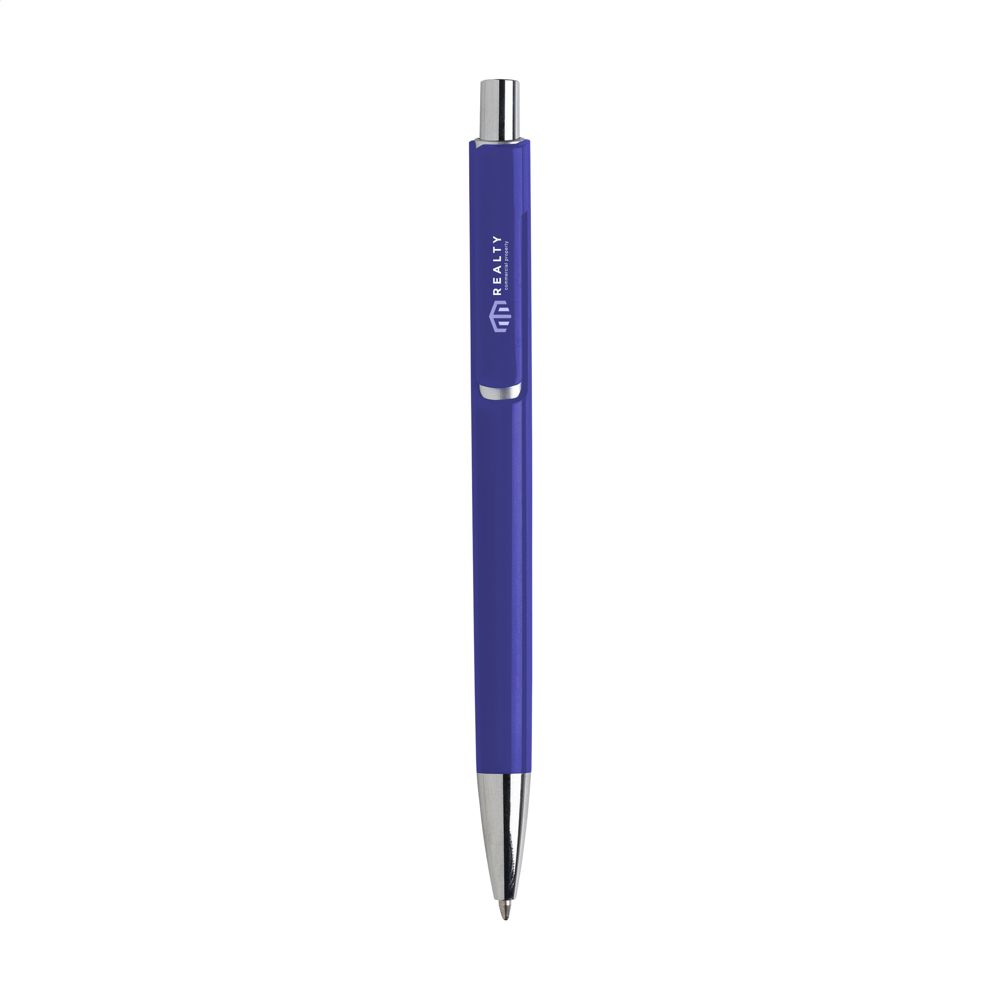 Blauwschrijvende balpen met uniek design: de body en clip van deze balpen zijn uit één geheel vormgegeven en dat maakt deze pen tot een bijzondere eyecatcher. Met opvallend zilverkleurig accent onder de optisch 'zwevende' clip.