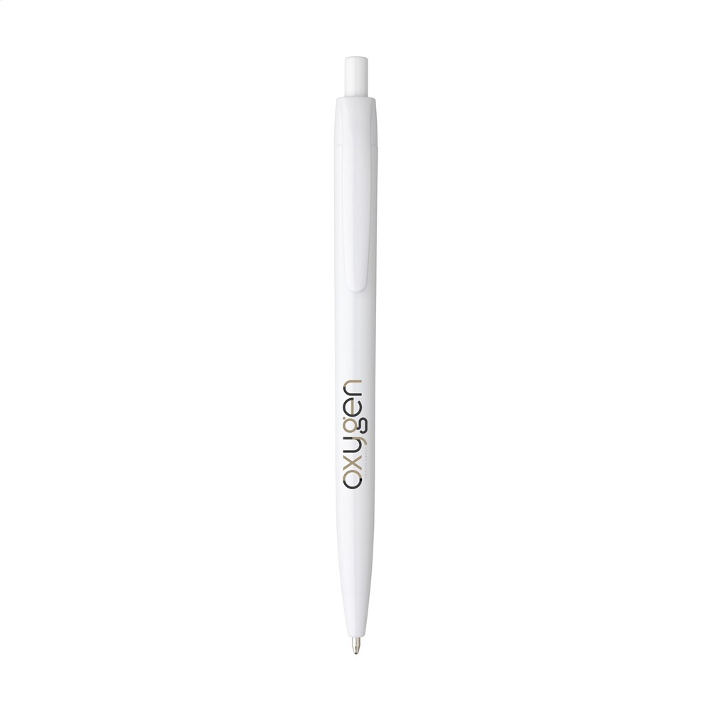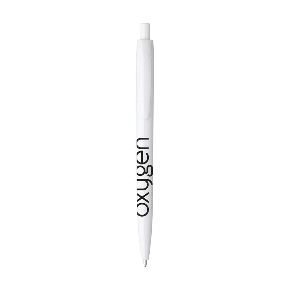 Blauwschrijvende balpen met houder uit één geheel. Zeer geschikt voor een royale opdruk.
