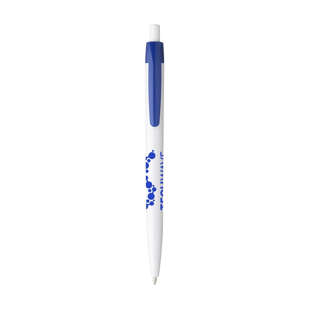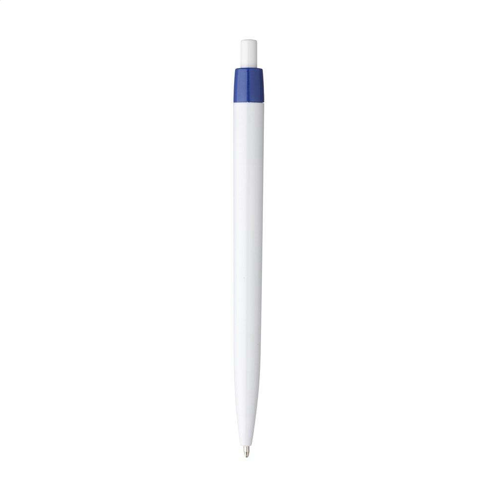 Blauwschrijvende balpen met houder uit één geheel. Zeer geschikt voor een royale opdruk.