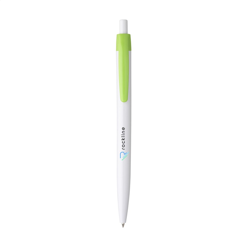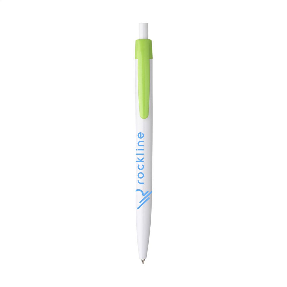 Blauwschrijvende balpen met houder uit één geheel. Zeer geschikt voor een royale opdruk.