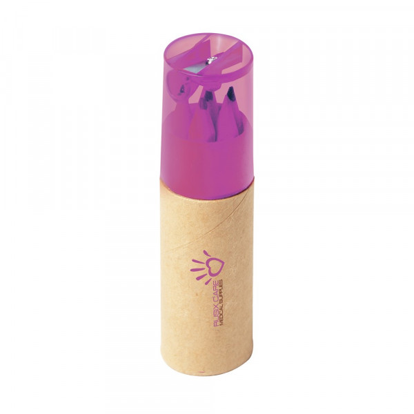 6 kleurpotloden verpakt in kartonnen koker met in de kunststof dop een puntenslijper.