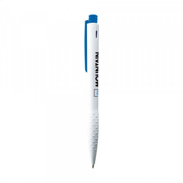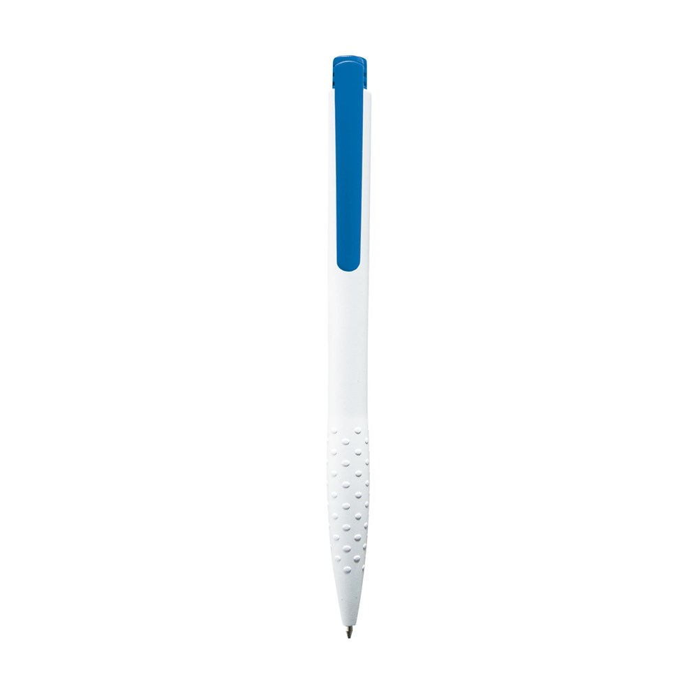 Blauwschrijvende óf zwartschrijvende balpen met gripvast voorstuk, gekleurde clip en drukknop.