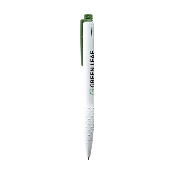 Blauwschrijvende óf zwartschrijvende balpen met gripvast voorstuk, gekleurde clip en drukknop.