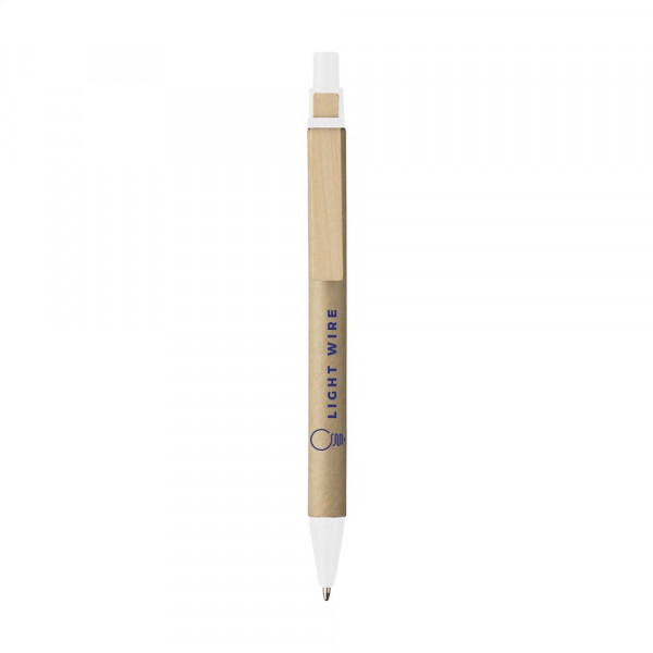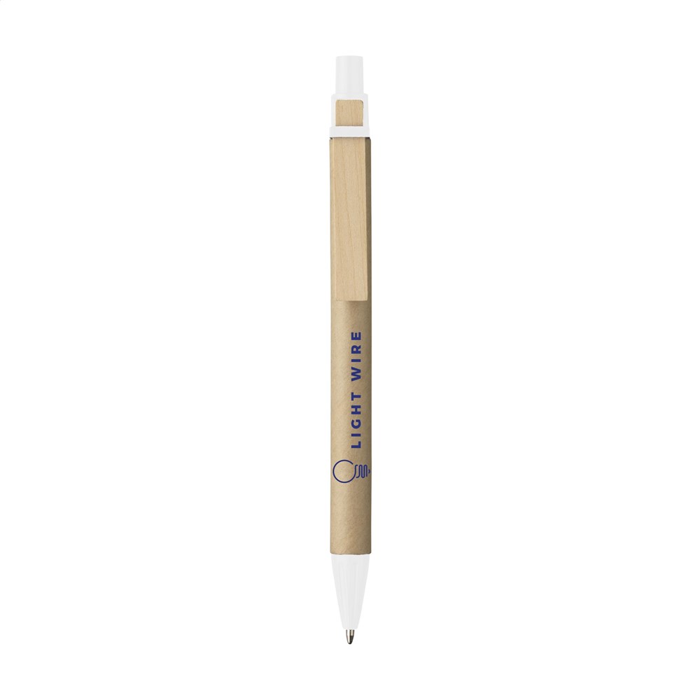 Blauwschrijvende balpen met houder van FSC Recycled gecertificeerd karton, houten clip en gekleurde kunststof accenten.