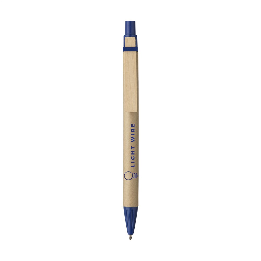 Blauwschrijvende balpen met houder van FSC Recycled gecertificeerd karton, houten clip en gekleurde kunststof accenten.
