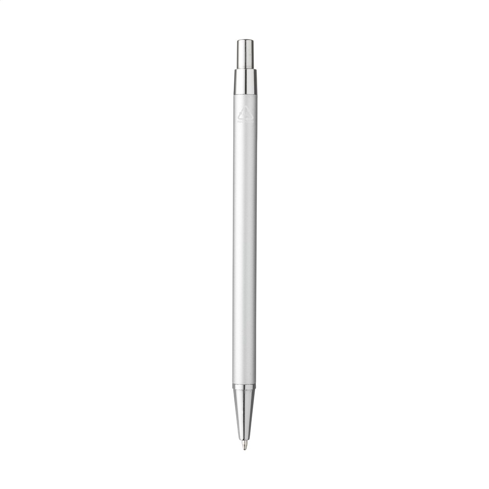 Blauwschrijvende balpen met een slanke houder van aluminium schrootafval. De houder van deze pen bestaat uit 85% gecertificeerd, gerecycled aluminium. Met stevige metalen clip en drukknop. Door het gebruik van gerecycled aluminium worden er minder nieuwe grondstoffen gebruikt tijdens de productie van dit product. Dit betekent minder energieverbruik en minder gebruik van water.