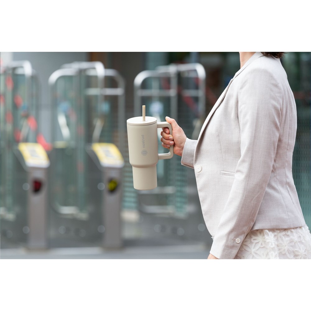 Grote, dubbelwandige drinkbeker van gerecycled RVS met rietje. De opvallende, stoere beker heeft een grote, kunststof handgreep en een schroefdeksel met een opening voor het meegeleverde, kunststof rietje. In deze enorme beker blijft drank voor langere tijd op temperatuur. Geschikt voor koude en warme dranken. Zonder rietje gaat de temperatuur niet verloren dankzij de siliconen afdichting in het deksel. Deze beker kan overal mee naartoe. Ideaal voor in de sportschool of op kantoor. Door de conische, smalle bodem past de beker in nagenoeg elke bekerhouder en is hij dus perfect voor onderweg. Niet vaatwasserbestendig. RCS-gecertificeerd. Totaal gerecycled materiaal: 75%. Inhoud 900 ml. Per stuk verpakt.