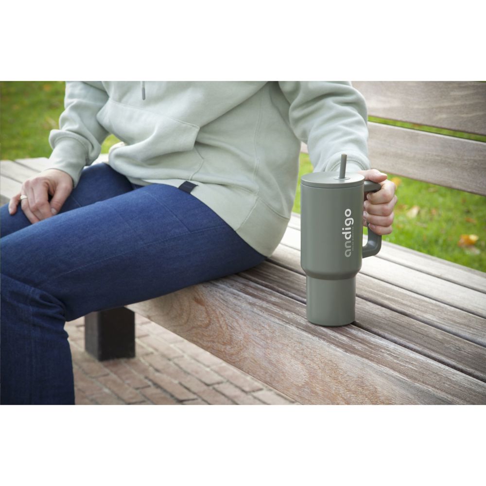 Grote, dubbelwandige drinkbeker van gerecycled RVS met rietje. De opvallende, stoere beker heeft een grote, kunststof handgreep en een schroefdeksel met een opening voor het meegeleverde, kunststof rietje. In deze enorme beker blijft drank voor langere tijd op temperatuur. Geschikt voor koude en warme dranken. Zonder rietje gaat de temperatuur niet verloren dankzij de siliconen afdichting in het deksel. Deze beker kan overal mee naartoe. Ideaal voor in de sportschool of op kantoor. Door de conische, smalle bodem past de beker in nagenoeg elke bekerhouder en is hij dus perfect voor onderweg. Niet vaatwasserbestendig. RCS-gecertificeerd. Totaal gerecycled materiaal: 75%. Inhoud 900 ml. Per stuk verpakt.