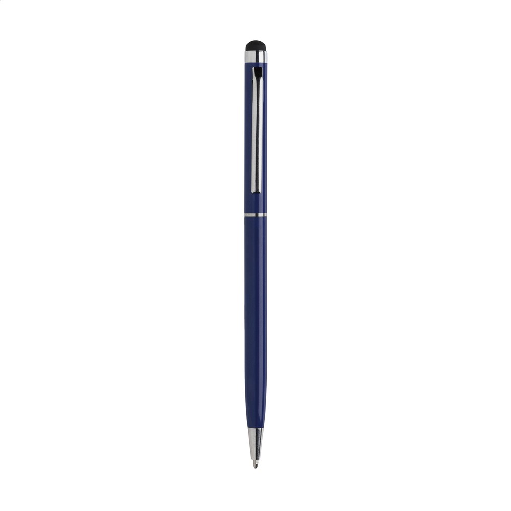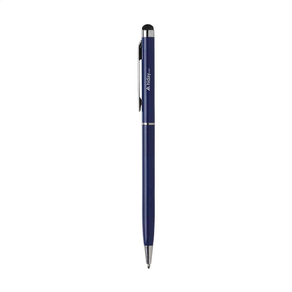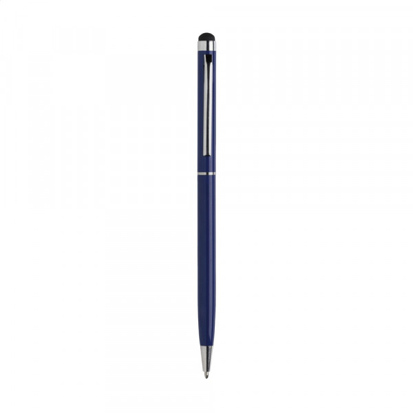 Blauwschrijvende, metalen balpen met rubberen top/pointer voor het bedienen van touchscreens (zoals iPhone/iPad), hoogglans accenten en draaikliksysteem.
