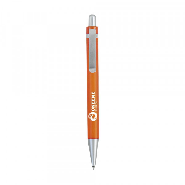 Blauwschrijvende balpen met transparantgekleurde houder en matmetalen clip.