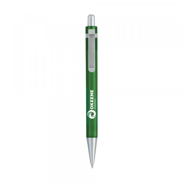 Blauwschrijvende balpen met transparantgekleurde houder en matmetalen clip.