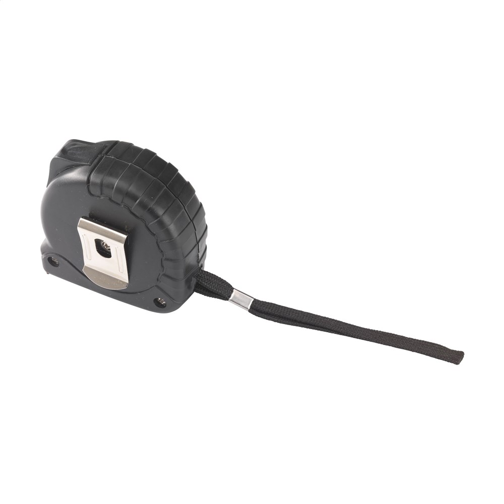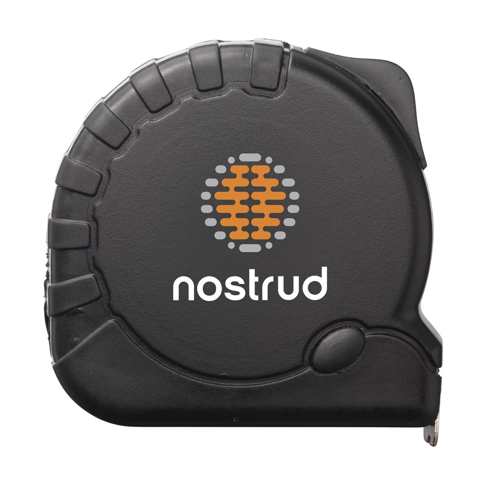 Rolmaat van gerecycled ABS plastic. Met hardstalen band (bandbreedte 19 mm), aanduiding in centimeters en inches, gripvast rubberen huis, ingebouwde, broekriemclip en polsriem. Per stuk verpakt.