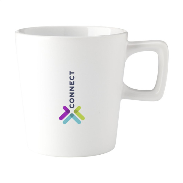 Moderne mok van hoogwaardig keramiek en 5% gerecycled keramiek. Het oor heeft een hoekige vorm en valt daardoor meteen op. De buitenzijde van de mok heeft een chique matte finish, de binnenzijde is afgewerkt in hoogglans. Vaatwasserbestendig. Inhoud 290 ml. OPMERKING: De witte mok kan niet worden voorzien van een lasergravure omdat deze onvoldoende zichtbaar is. Gerecyclede keramische mokken worden vervaardigd door grondstoffen te mengen met fragmenten van kapotte of onbruikbare mokken die in dezelfde fabriek zijn verzameld. Deze afgedankte componenten worden fijngemalen tot poeder en vervolgens gemengd met essentiële stoffen zoals kaolien en kwarts voordat ze worden omgezet in nieuwe keramische producten. Het uiteindelijke product bestaat doorgaans uit 5% tot 10% gerecycled keramiek om een optimale kwaliteit te garanderen. Het gebruik van gerecycled keramiek bevordert de circulaire economie en vermindert de behoefte aan nieuwe grondstoffen.