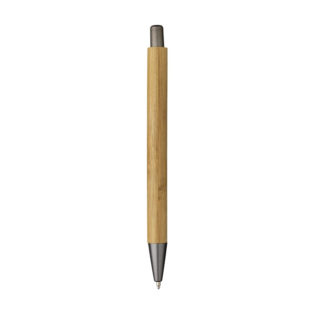 Blauwschrijvende balpen met mooie bamboe houder, kunststof puntstuk en drukknop en metalen clip.meer