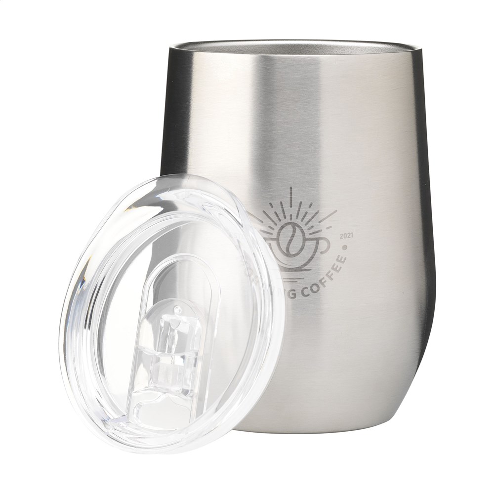 Dubbelwandige drinkbeker. De binnen- en buitenwand zijn gemaakt van gereycled RVS. Hierdoor blijft warme drank langere tijd op temperatuur. De beker valt direct op door de bijzonder mooie vormgeving en fraaie matte finish. Het transparante kunststof push-on deksel is voorzien van een afsluitbare drinkopening. Niet vaatwasserbestendig. Inhoud 350 ml. RCS-gecertificeerd. Totaal gerecycled materiaal 74%. Per stuk verpakt.
