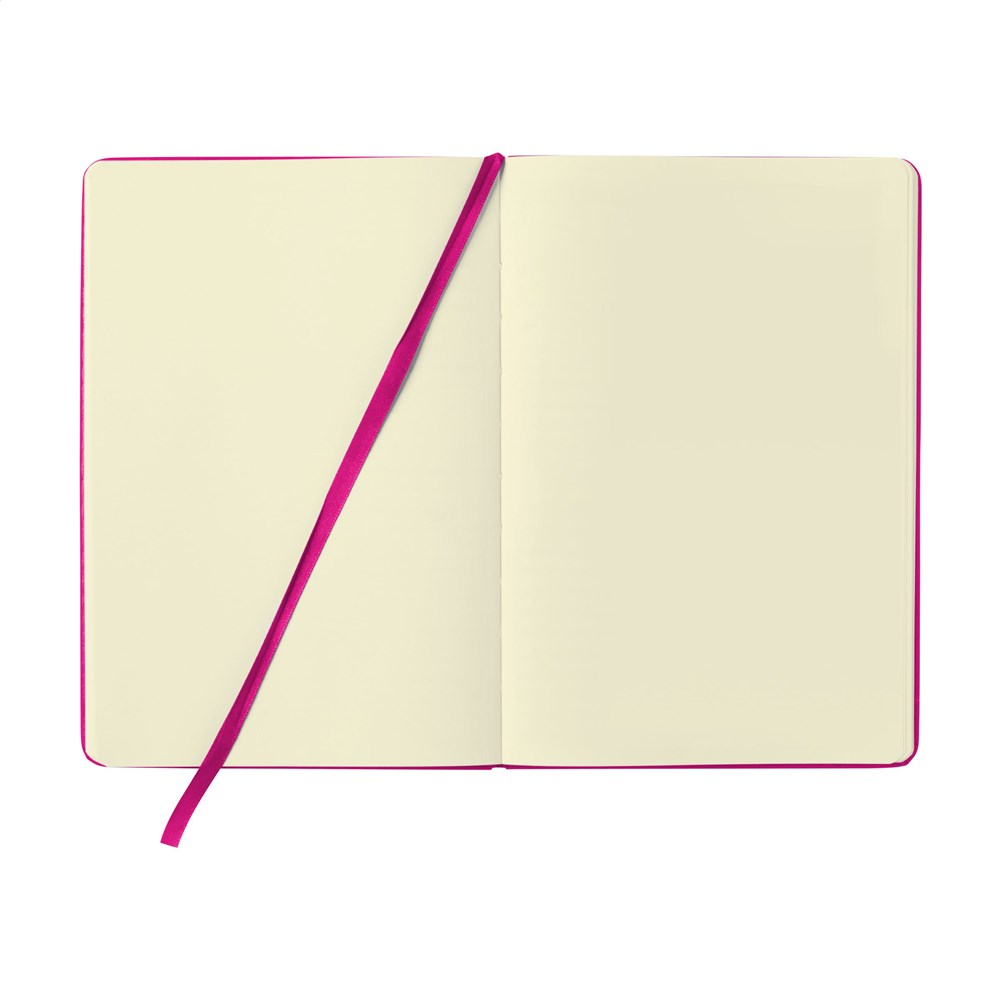 Praktisch notitieboekje in A5-formaat. Met harde PU cover, ca. 80 vel/160 pagina's crèmekleurig, ongelinieerd FSC Mix papier (70 g/m²), elastische sluiting en leeslint.