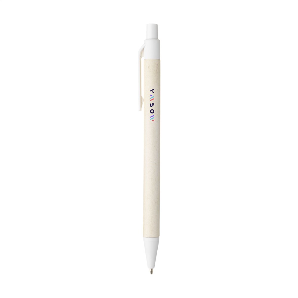 Blauwschrijvende balpen. De houder van deze pen is gemaakt van gerecyclede melkpakken. De clip, drukknop en het puntstuk zijn gemaakt van PLA. PLA is een biologisch afbreekbaar materiaal, gemaakt van maïszetmeel dat door planten wordt geproduceerd - natuurlijk en hernieuwbaar. Door het gebruik van gerecycelde materialen kunnen kleine oneffenheden in het materiaal zichtbaar zijn. Dit geeft het product een unieke uitstraling.