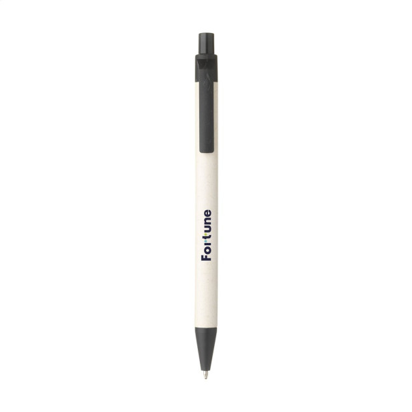 Blauwschrijvende balpen. De houder van deze pen is gemaakt van gerecyclede melkpakken. De clip, drukknop en het puntstuk zijn gemaakt van PLA. PLA is een biologisch afbreekbaar materiaal, gemaakt van maïszetmeel dat door planten wordt geproduceerd - natuurlijk en hernieuwbaar. Door het gebruik van gerecycelde materialen kunnen kleine oneffenheden in het materiaal zichtbaar zijn. Dit geeft het product een unieke uitstraling.