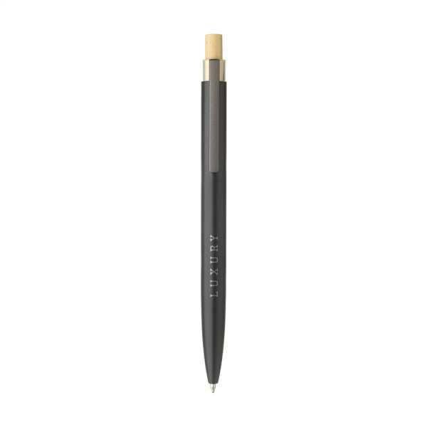 Modieuze, blauwschrijvende balpen met een houder van 100% gerecycled aluminium, afgewerkt met een matte finish. De bamboe drukknop heeft een transparant accent. De houder bestaat uit één geheel en is standaard bedrukt met het 'recycled aluminium logo'. GRS-gecertificeerd. Door het gebruik van gerecycled aluminium worden er minder nieuwe grondstoffen gebruikt tijdens de productie van dit product. Dit betekent minder energieverbruik en minder gebruik van water.