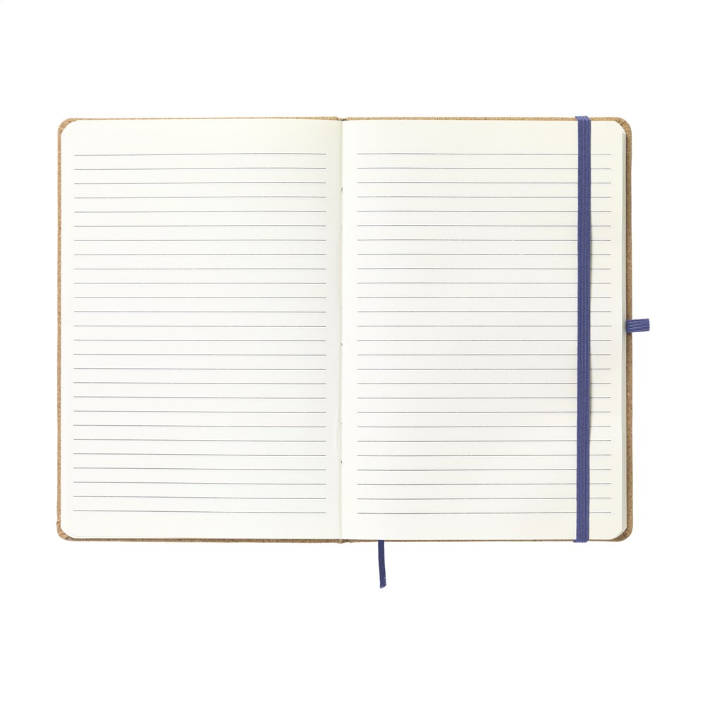A5-formaat notitieboekje van kurk. Met ca. 80 vel/160 pagina's crèmekleurig, gelinieerd, FSC Mix gecertificeerd papier (70 g/m²). Met handige penlus, sluitelastiek en leeslint.