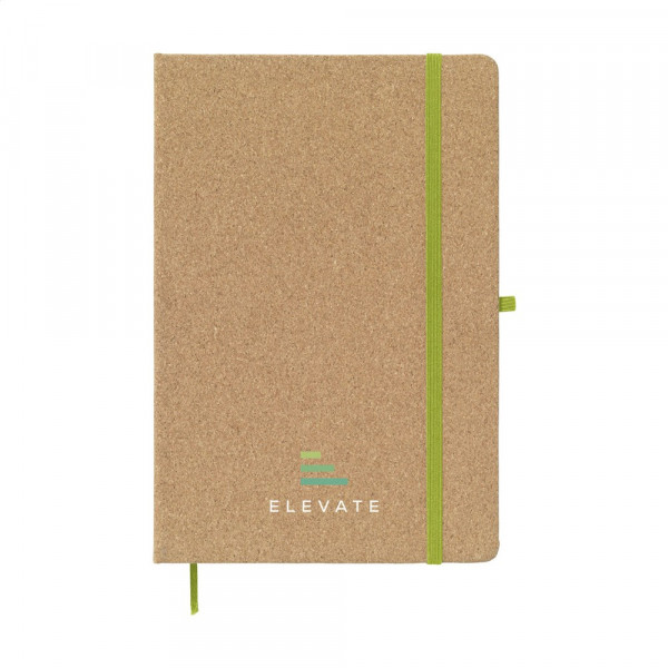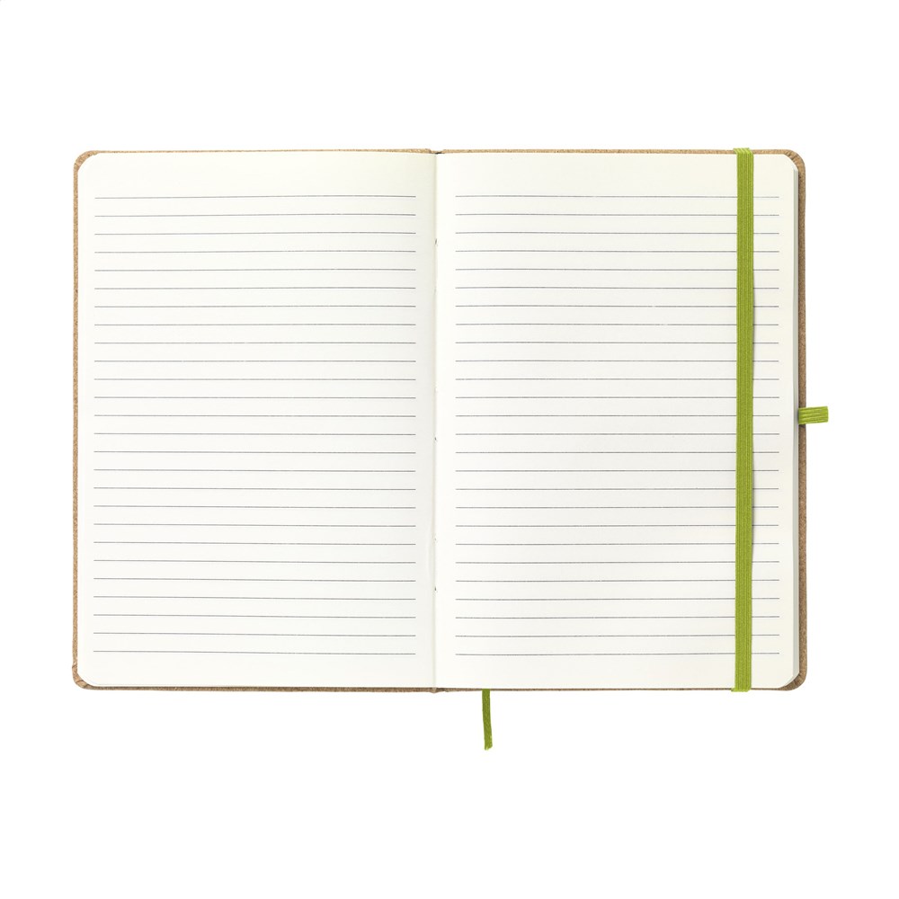 A5-formaat notitieboekje van kurk. Met ca. 80 vel/160 pagina's crèmekleurig, gelinieerd, FSC Mix gecertificeerd papier (70 g/m²). Met handige penlus, sluitelastiek en leeslint.
