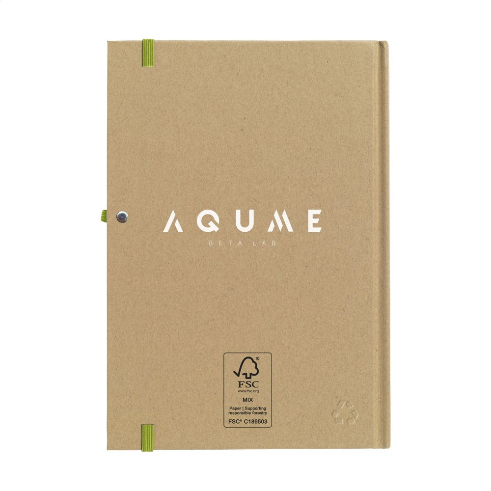 A5-formaat notitieboekje van gerecycled materiaal. Met ca. 80 vel/160 pagina's crèmekleurig, gelinieerd FSC Mix gecertificeerd papier (70 g/m²), handige penlus en sluitelastiek.
