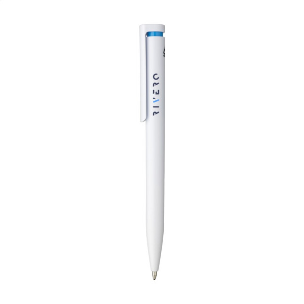 Blauwschrijvende balpen met houder gemaakt van 100% gerecycled ABS. De clip/drukknop heeft een opvallend kleuraccent en biedt ruimte voor een royale digitale full colour opdruk. GRS-gecertificeerd.